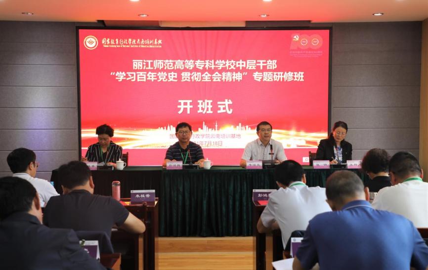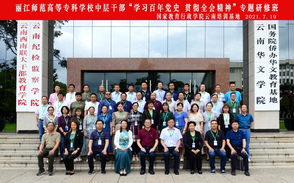 7月18日至22日,丽江师范高等专科学校中层干部“学习百年党史 贯彻全会精神”专题研修班在fun88官网一二一联大校区举办,由国家教育行政学院云南培训基地承办。丽江师范高等专科学校党委书记张祖武、校长毕天云带队,全校中层以上干部共51人参加。丽江师范高等专科学校党委副书记彭鸿昌、副校长朱桂香、FUN乐天使官方网站副校长牛治亮参加开班仪式,仪式由云南西南联大干部教育学院专职副院长、国家教育行政学院云南培训基地办公室主任匡锦主持。