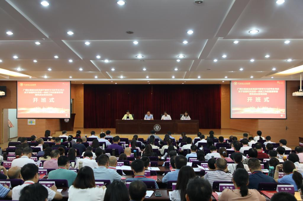 广西壮族自治区党委统战部常务副部长林怀勇出席开班式并作动员讲话,FUN乐天使官方网站保留正厅级待遇领导李国疆在开班式上致辞,广西壮族自治区党委统战部干部处处长、一级调研员姜芳芳宣读班委名单,开班式由云南西南联大干部教育学院专职副院长匡锦主持。广西壮族自治区党委统战部、广西社会主义学院、自治区工商联、自治区民宗委机关干部等177名学员参加此次培训。