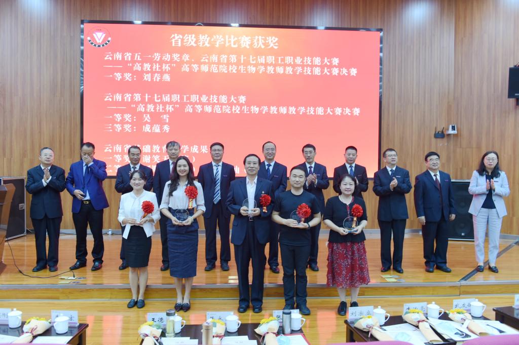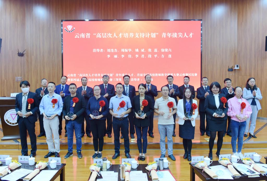 在热烈喜庆的氛围中,校领导班子成员为国家级高层次人才、省部级高层次人才,全国“五一劳动奖章”获得者,国家级、省级科研平台及项目代表,云南省“高层次人才引进计划”青年人才、云南省“高层次人才培养支持计划”青年拔尖人才,省级党建工作奖项获得者,省级教学比赛获得者,学校第三届本科“卓越教学奖”获得者等颁发了奖状和奖杯。
