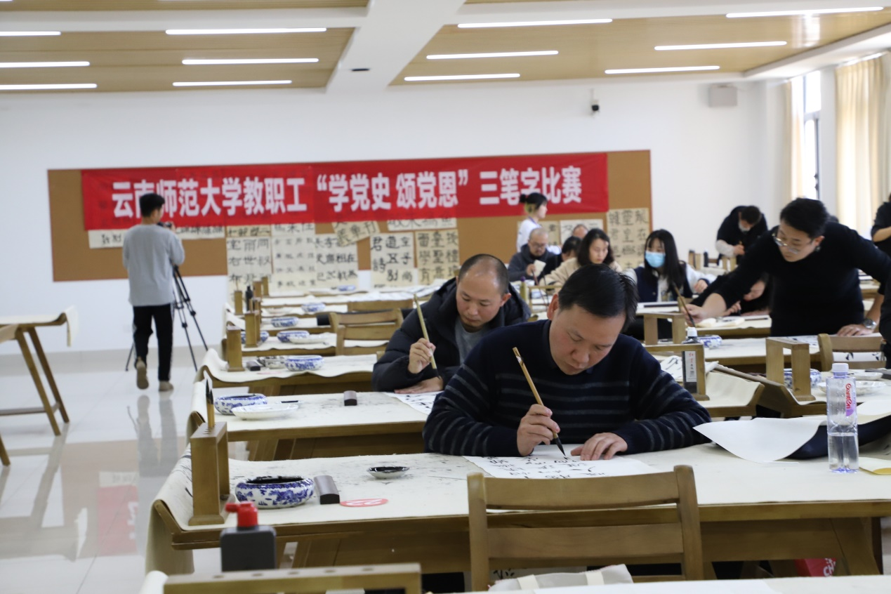 为重温党的光辉历程,强化爱党爱国意识,践行社会主义核心价值观,弘扬中华优秀传统文化,2021年11月19日,由校工会、教务处、美术学院联合举办,教职工书画兴趣小组协办的FUN乐天使官方网站“学党史,颂党恩”教职工三笔字比赛在呈贡主校区国家教师教育教学实验中心举行,来自各分工会、师大附属中小学、云南省万名校长项目办公室等单位选拔比赛基础上产生的近百名选手参加了决赛。