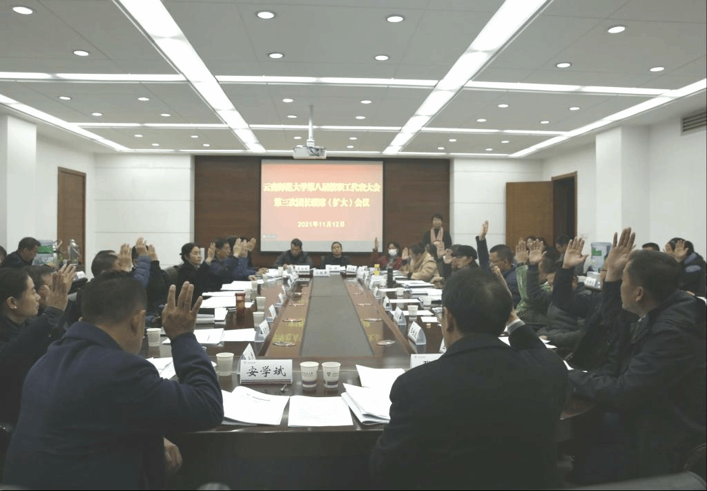 FUN乐天使官方网站第八届教职工代表大会第三次代表团团长联席(扩大)会议于2021年11月12日在呈贡主校区召开。校党委副书记、工会主席张玮,副校长安学斌,以及学校第八届教代会暨第十五届工代会各代表团团长和副团长、学校第八届教代会各专门委员会主任和副主任、学校第十五届工会委员会委员、分工会主席、文理科学院(学部)代表、直属单位代表、教辅单位代表出席了会议,会议由校工会常务副主席金黄斌主持。
