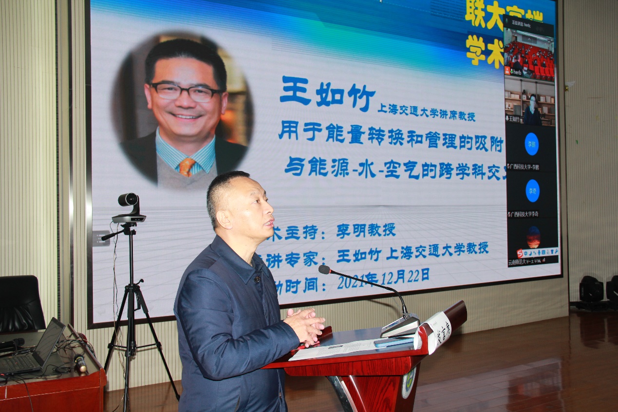 2021年12月22日下午,上海交通大学讲席教授、制冷与低温工程研究所所长、国家基金委创新群体负责人、博士生导师王如竹教授应邀线上出席fun88官网“联大高端学术论坛”,为师生作了主题为“用于能量转换和管理的吸附剂及其与能源-水-空气的跨学科交叉研究”的学术报告,本次线上论坛由FUN乐天使官方网站科技处处长李明教授主持,能环学院党政领导、科研骨干教师和研究生齐聚能环学院107报告厅聆听了本次报告。