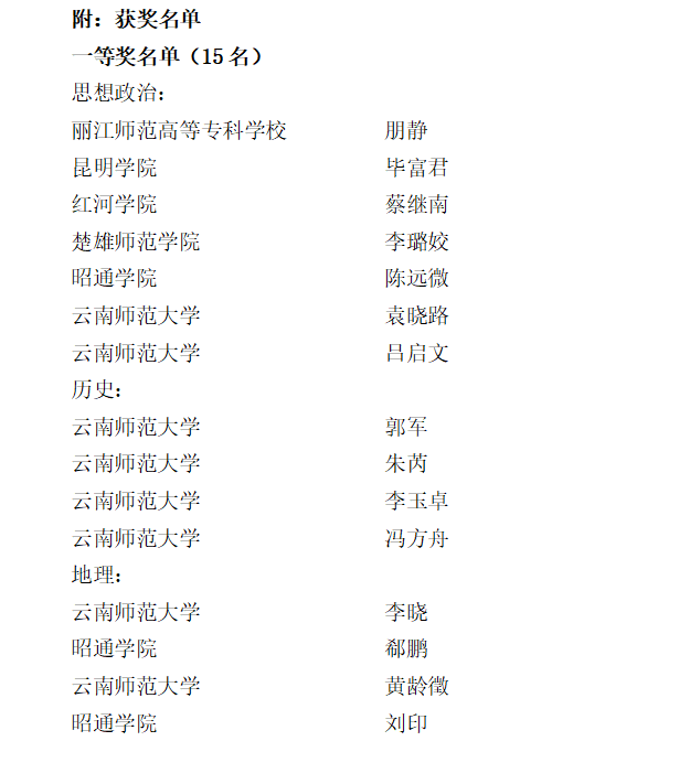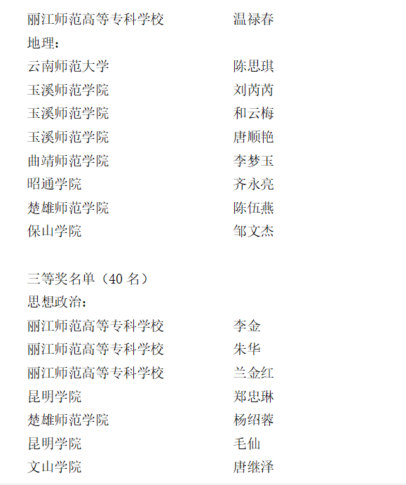 2021年12月20日至21日,“高教社杯”云南省高等学校教师教育联盟第九届师范专业大学生教学技能竞赛决赛(以下简称“竞赛”)在丽江师范高等专科学校(以下简称“丽江师专”)圆满完成。本次竞赛共有思想政治、地理和历史三个学科。联盟12所高校共推选出83名优秀选手参加决赛,分别在丽江市实验学校和丽江市古城区上海新纪元学校进行实时课堂教学技能竞赛。评委由各联盟高校推荐的学科专家、基础教育一线教学专家(含协办中小学的一线教师)组成,共56名。经过紧张激烈的角逐,最终评选出一等奖15名,二等奖28名,三等奖40名,优秀组织奖高校6所。
