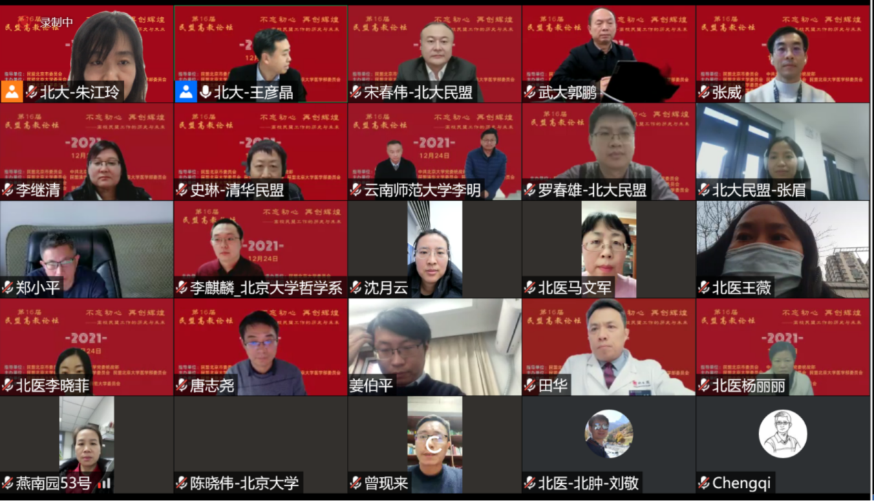 2021年12月24日,由民盟北京大学委员会、民盟清华大学委员会、北京大学医学部委员会“两校三委”主办,民盟北京大学委员会承办,民盟FUN乐天使官方网站委员会、民盟武汉大学委员会作为特邀单位共同协办的第十六届民盟高教论坛通过线上方式举行。校党委副书记、统战部部长张玮教授、民盟FUN乐天使官方网站委员会主委李明教授以及云南师大民盟盟员代表、校党委统战部人员参加了论坛。