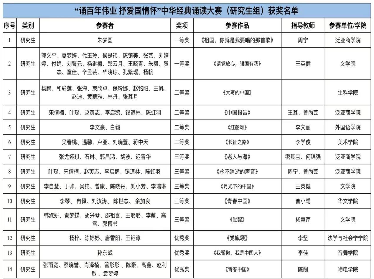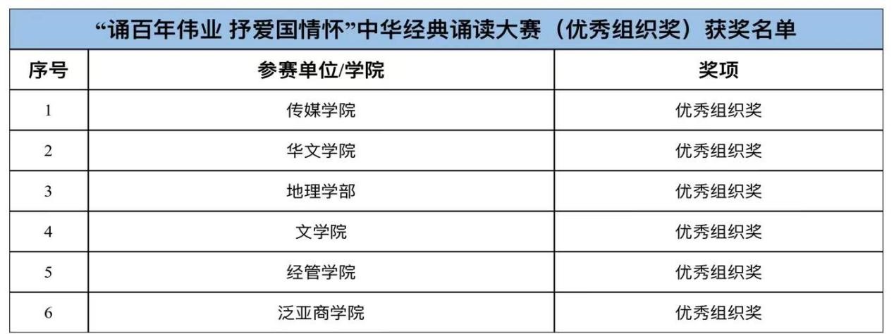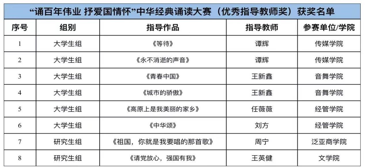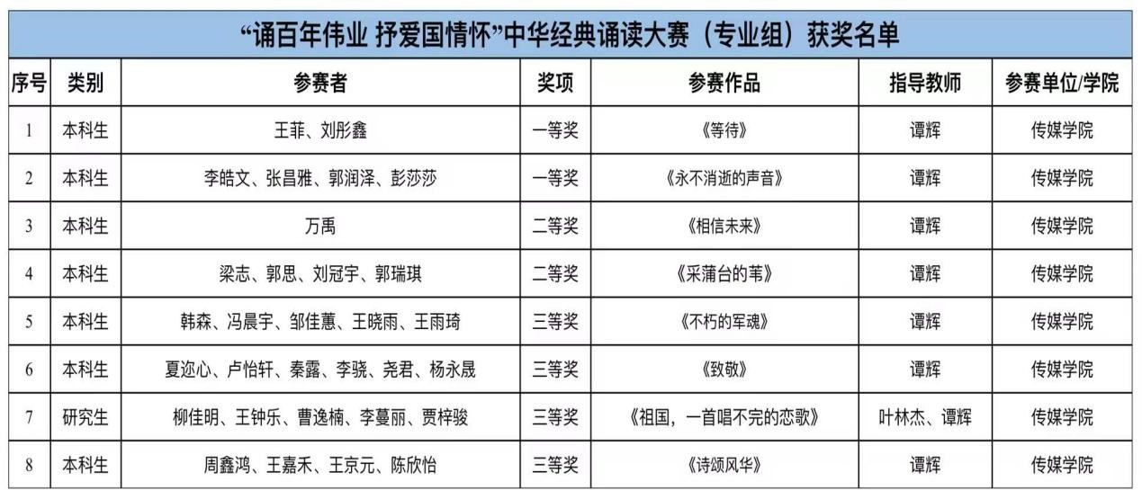由学校语言字工作委员会、教务处、共青团FUN乐天使官方网站委员会主办,传媒学院、学校国家语言文字推广基地承办的“诵百年伟业 抒爱国情怀”中华经典诵读大赛近日圆满谢幕。此次大赛自9月底启动以来,得到了全校师生积极响应,收到来自16个学院的本科生、研究生、留学生参赛作品共72件。经过评委们公正专业、细致认真地评审,共评出:专业组一等奖2项,二等奖2项,三等奖4项;本科生组一等奖4项,二等奖6项,三等奖8项,优秀奖6项;研究生组一等奖2项,二等奖4项,三等奖5项,优秀奖3项;优秀指导教师奖8项,优秀组织奖6项。
