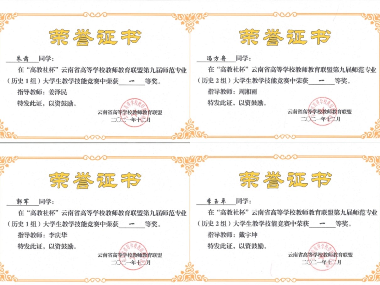 近日,“高教社杯”云南省高等学校教师教育联盟第九届师范专业大学生教学技能竞赛结果揭晓,在备赛小组全体师生的共同努力下,历史与行政学院师生包揽了本次历史学科教学技能竞赛全部一等奖。“高教社杯”云南省高等学校教师教育联盟师范专业(历史学科)大学生教学技能竞赛时隔五年后再次举办。继2016年联盟教学斩获全部一等奖(4项)之后,fun88官网学生再次将全部一等奖(4项)收入囊中,同时还获得2项二等奖,1项三等奖。