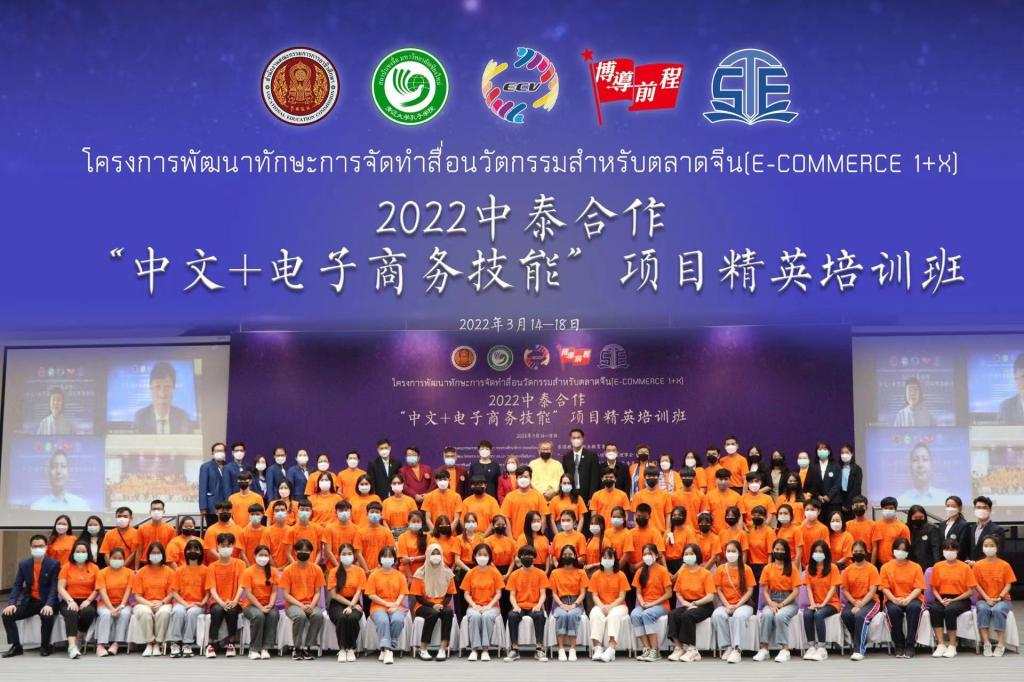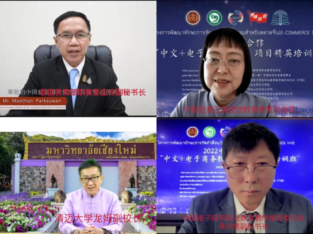 2022年3月14日,2022年中泰合作“中文+电子商务技能”项目精英培训班于泰国清迈大学学术中心正式开班。fun88官网郝淑美副校长、泰国教育部职业教育委员会孟佟•帕素万(Mr.Monthon Parksuwan)副秘书长、中国驻泰国大使馆冯俊英参赞、中国电子商务职业教育教学指导委员会陆春阳副主任、清迈大学龙姆副校长、北京博导前程信息技术股份有限公司段建董事长、清迈大学孔子学院中泰方院长等领导和来自中泰院校教师、参训学生以及企业代表近100人共同出席开班仪式。