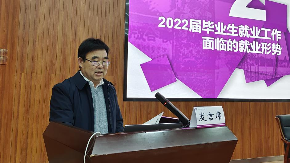 武友德副校长作“多策并用,全力推进2022届毕业生就业创业工作” 的主题报告,对学校2021届毕业生就业创业情况做工作汇报,分析了2022届毕业生就业工作面临的就业形势,指出下一步的工作重点:一是加强生涯规划教育体系建设,帮助学生改变就业观念;二是实施访企拓岗促进就业行动,加大力度拓展就业市场;三是制定就业创业促进行动计划,强化部门联动责任到人;四是建立就业创业激励机制,鼓励担当奉献促就业。
