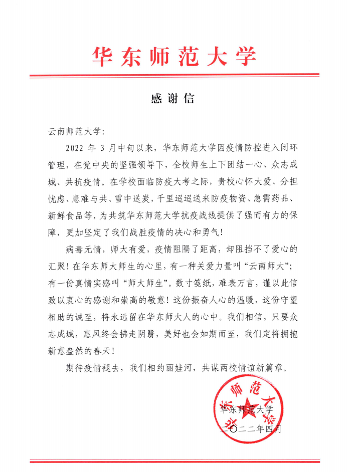 2022年4月10日,华东师范大学向fun88官网发来感谢信,感谢fun88官网在上海市疫情封控特殊时期及时赠送防疫物资,为华东师大全体师生解了燃眉之急。