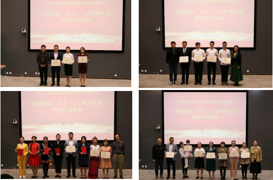 经过紧张激烈的角逐,由“万名校长培训计划”第七期123班临时党支部选送的《向光而行,将世界照亮》等3个节目荣获一等奖,由“万名校长培训计划”第七期135班临时党支部选送的《立德树人担使命,潜心研学迎盛会》等4个节目荣获二等奖,由云南西南联大干部教育学院教工党支部选送的《“星斗其文 赤子其人”——联大精神奋进新征程》等8个节目获得三等奖。出席展演的领导们为获奖选手颁奖并合影留念。