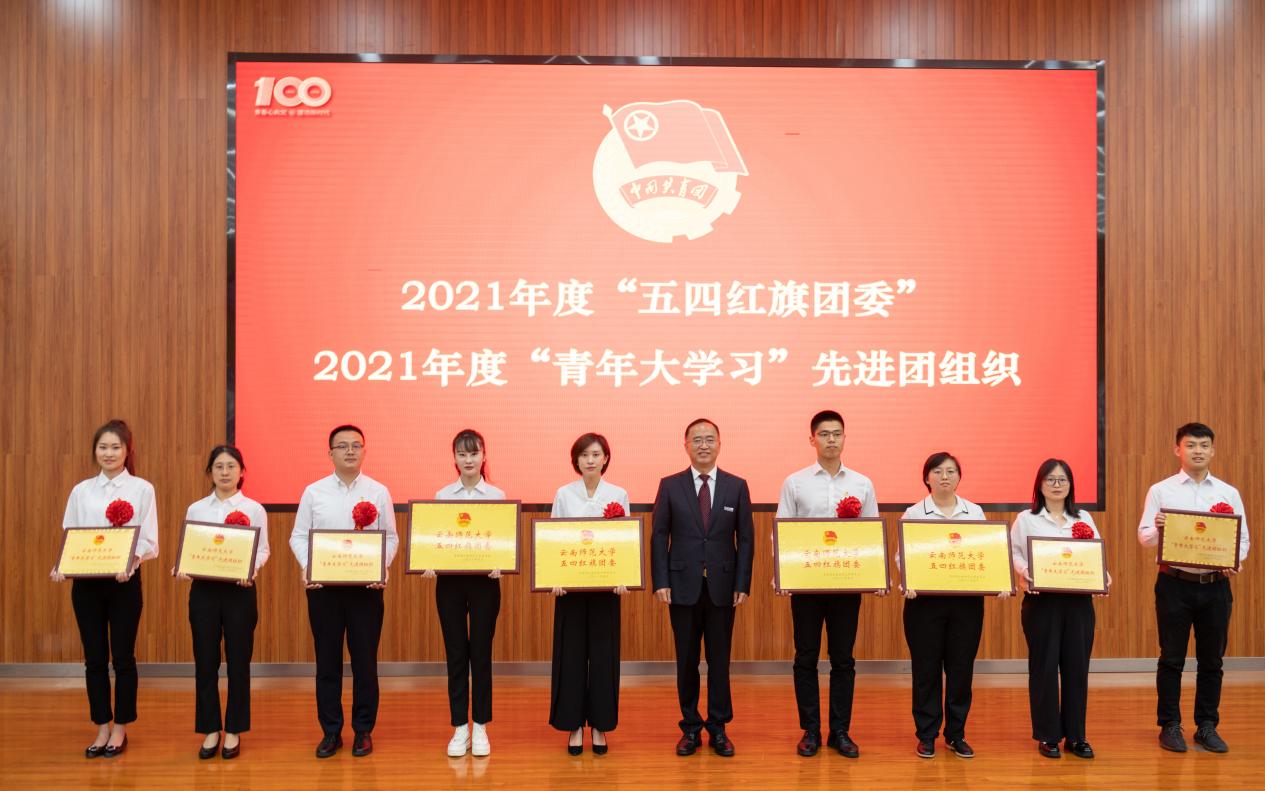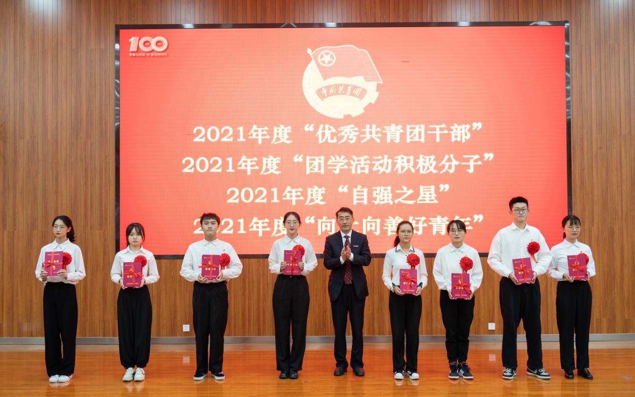 出席表彰大会的领导依次为2021年度“优秀学生会”和“五星级社团”,2021年度“优秀共青团干部”“团学活动积极分子”、“自强之星”“向上向善好青年”,2021年度“优秀团委书记”“五四红旗团支部”“优秀共青团员”,2021年度“五四红旗团委”“青年大学习”先进团组织颁奖。
