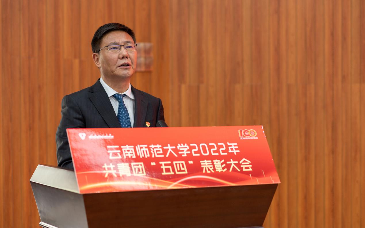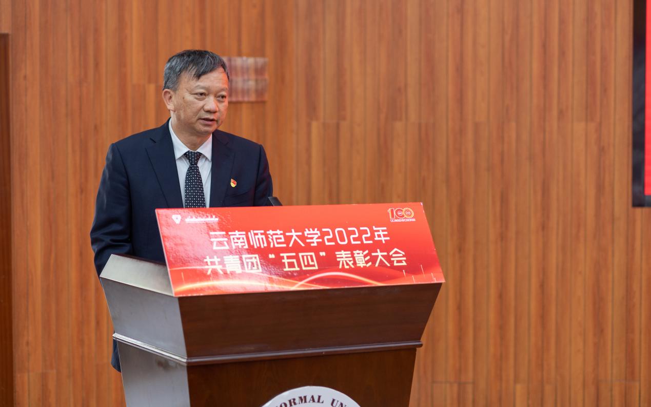 校党委书记蒋永文在讲话中代表学校党委向全体受表彰的集体和个人表示热烈的祝贺,向全校广大共青团员致以节日的亲切问候,向默默战斗奉献在工作一线的各级团干部、教师、学生骨干致以崇高的敬意。蒋书记指出,习近平总书记在庆祝中国共产主义青年团成立100周年大会上的重要讲话为各级团组织进一步守正创新、奋楫争先,团结带领青年团员在实现中华民族伟大复兴的时代洪流中踔厉奋发、勇毅前进提供了根本遵循,为全体共青团员坚定理想信念,感党恩、听党话、跟党走,把青春奋斗融入党和人民事业,努力成为实现中华民族伟大复兴的先锋力量指明了前进方向。全校各级团组织、全体共青团员要始终牢记习近平总书记对广大青年的殷切嘱托,牢记建团百年的梦想与光荣,以更加坚定执着的理想信念、忠贞不渝的为民情怀,把爱国之情、报国之志转化为勤奋学习、干事创业的实际行动,在新时代国家和云南高质量发展中再立新功。随后,蒋书记向全校各级团组织、全体共青团员提出希望:一是强化政治“主心骨”,始终坚定不移跟党走;二是强化思想“导航仪”,始终坚定不移用党的创新理论武装头脑;三是强化改革“发动机”,始终坚定不移深化全面从严治团;四是强化服务“润滑剂”,始终让青年感受到“家”的温暖;五是争做时代“弄潮儿”,努力成长为堪当民族复兴重任的时代新人。蒋书记要求全校广大青年深入学习贯彻习近平总书记在庆祝中国共产主义青年团成立100周年大会上的重要讲话精神,坚定不移爱党、爱国、爱人民,立鸿鹄志、做奋斗者,求真学问、练真本领,知重负重、勇毅笃行。紧密团结在以习近平同志为核心的党中央周围,坚决践行“请党放心、强国有我”的青春誓言,以青春之我、奋斗之我,为民族复兴铺路架桥,为祖国建设添砖加瓦,在青春的赛道上奋力奔跑,争取跑出最好成绩,让中华民族的伟大复兴在奋斗中梦想成真。
