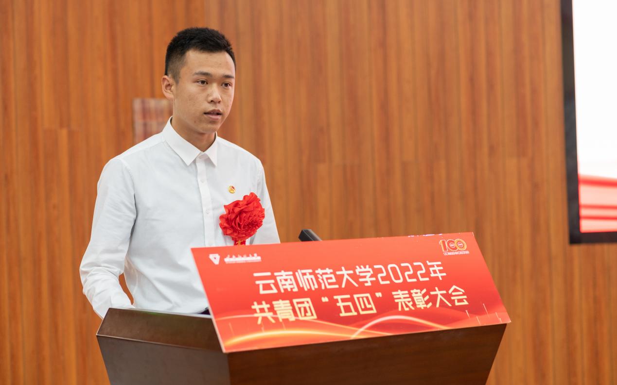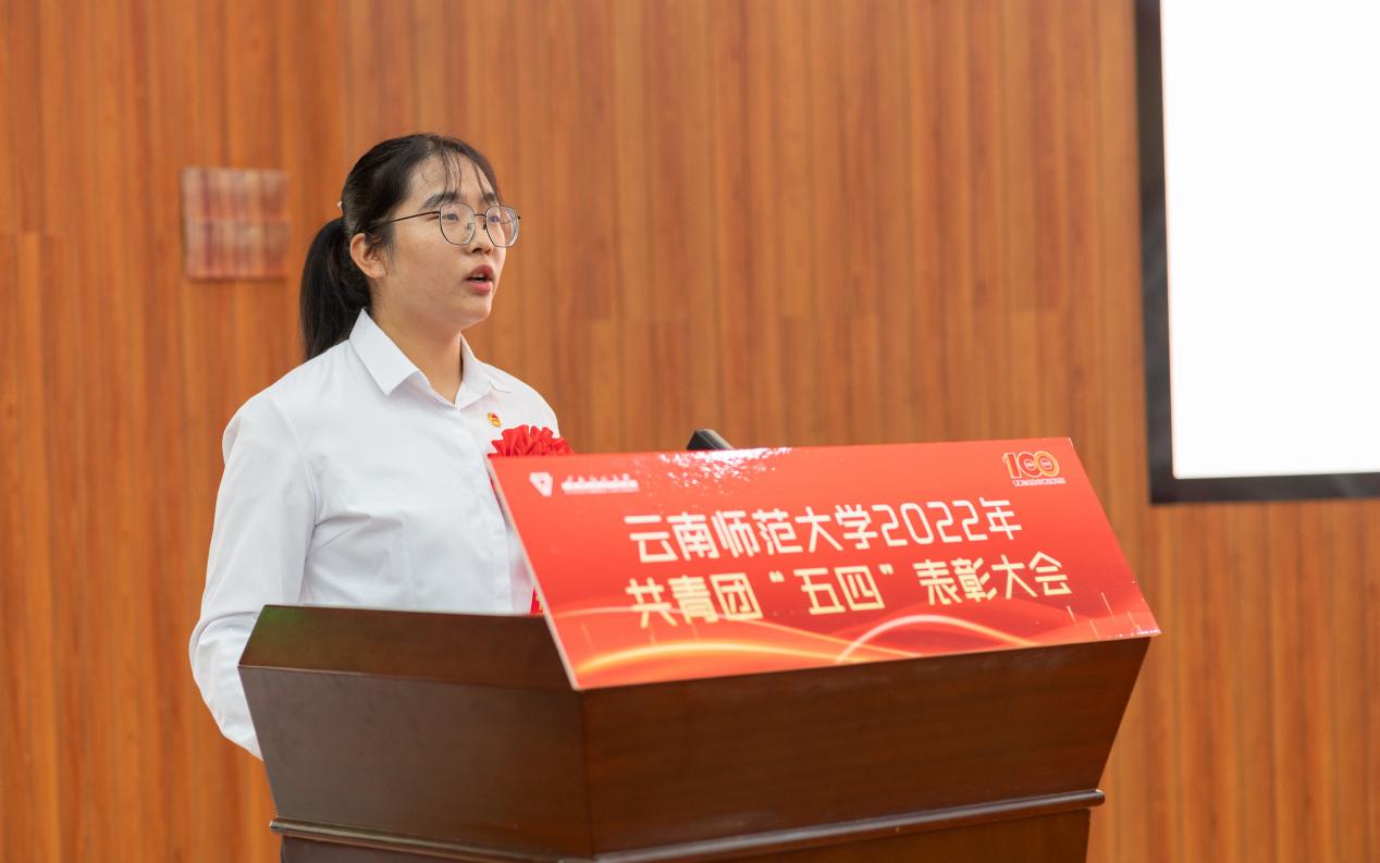 受表彰的集体和个人代表发言。“优秀共青团员”代表、法学与社会学学院硕士研究生杨愫同学分享了自己从大一开始就参与德宏州梁河县的扶贫公益活动,积极投身大学生志愿返乡、法律宣传进校园、疫情防控等社会实践的经历,表示将时刻牢记习近平总书记对青年的教诲,更加努力学习,增强本领,立志服务社会、民族复兴,在青春的赛道上争取跑出当代青年的最好成绩。“优秀共青团干部”代表、历史与行政学院行政管理专业杨瀛枫同学表示,作为团支部书记,他始终立足团的基本建设,扎实推进团的基本工作、创新实践,在工作实践中锤炼本领、增长才干,在困难中磨砺自己,在为同学服务中实现自己的价值。作为中国共产党的后备军,今后将把自己的命运同国家民族的命运紧紧联系在一起,在社会的广阔天地大展身手,当“实干家”、做“排头兵”,为中华民族伟大复兴贡献青春力量。优秀团支部代表、数学学院2018级E班公费师范团支部景思瑜同学发言,分享了所在团支部作为全国高校“活力团支部”在提升教师素养、突出思政教育、打造长效品牌等方面经验举措。景思瑜表示,作为团支部书记,将继续努力,锐意进取,做好支部工作,继续将成为一名“四有好老师”作为奋斗目标,为祖国教育事业发展服务。
