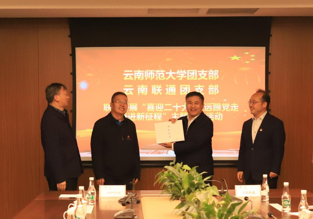 fun88官网蔡金红副校长向云南联通团委赠送合作共建纪念品,希望双方共青团员和团干部在新时代征程中,更加紧密地团结在以习近平同志为核心的党中央周围,高举习近平新时代中国特色社会主义思想伟大旗帜,不负韶华,不负时代,不负人民,始终牢记、忠实践行习近平总书记对青年和共青团工作的期望与要求,以更加优异的成绩迎新党的二十大胜利召开。
