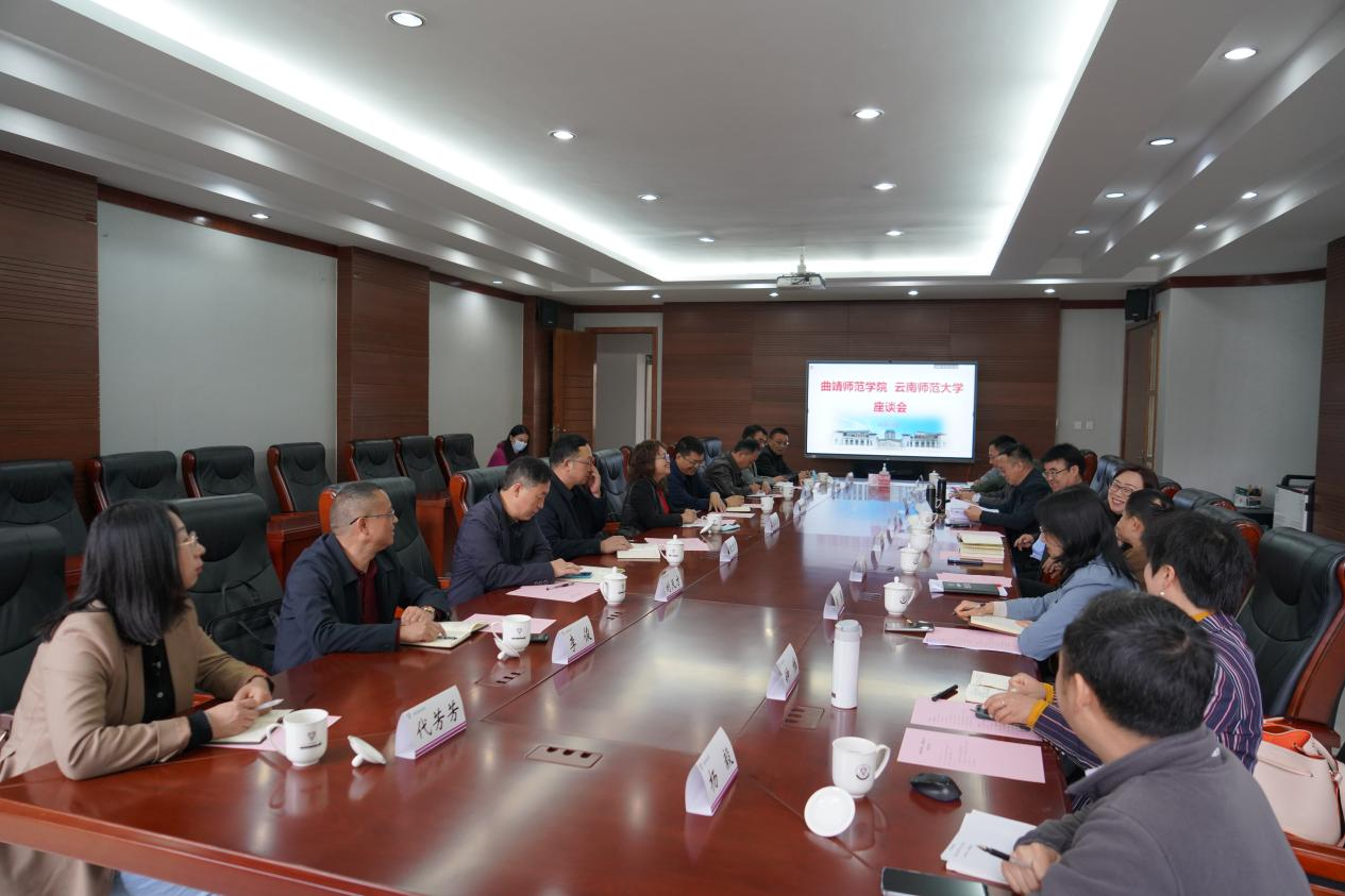 2022年5月17日上午,曲靖师范学院党委委员、副校长郭丽红及相关部门负责人一行9人到fun88官网考察交流。双方在呈贡校区行政楼341会议室举行交流座谈会,fun88官网武友德副校长、郝淑美副校长,教务处、人事处、学生处、对外合作交流处、科技处、教学质量监控与评估中心等部门负责人参加座谈会。座谈会由武友德副校长主持。