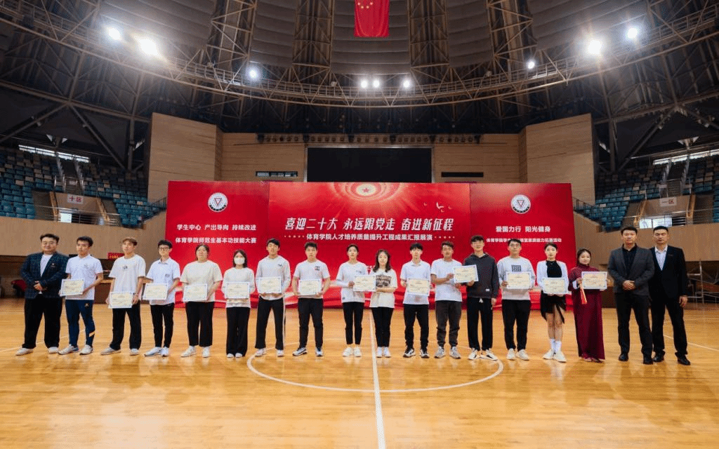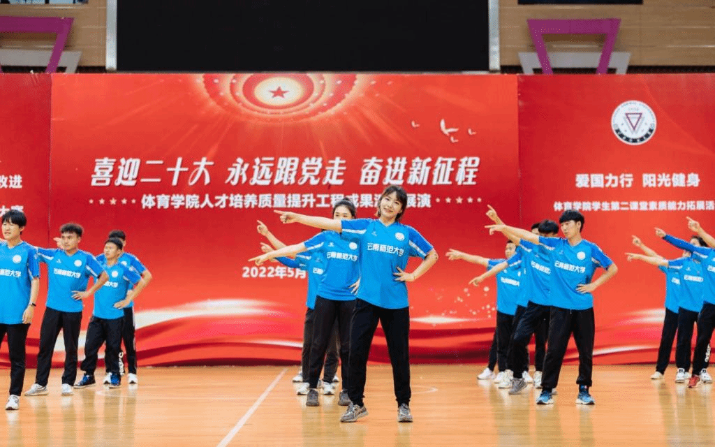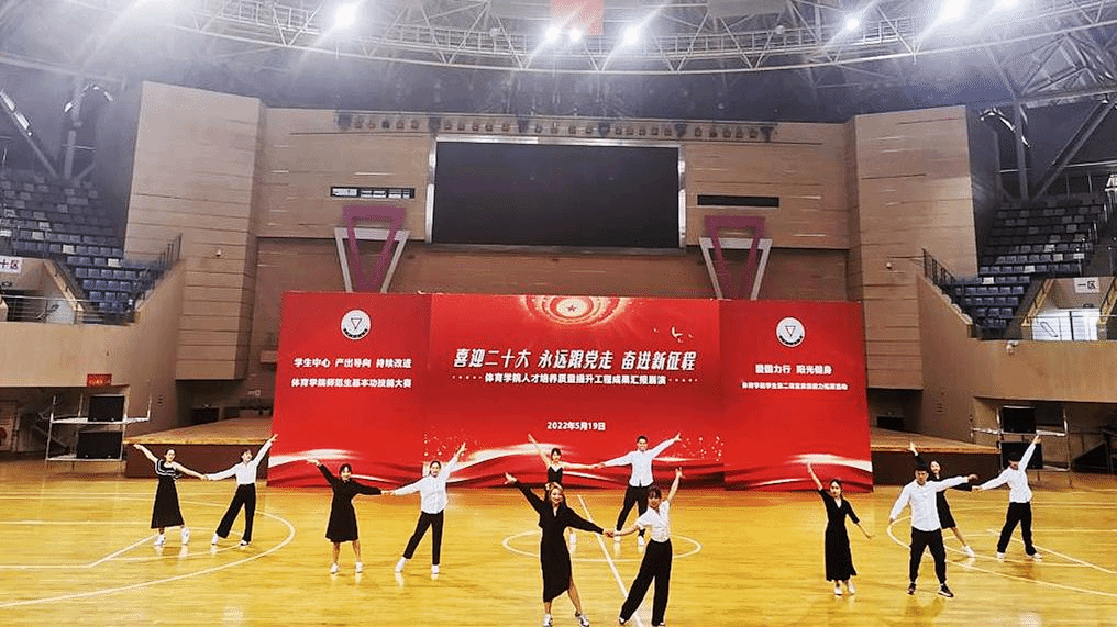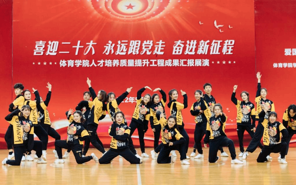 为进一步贯彻让体育活动引领校园文化的精神,推进学校阳光体育蓬勃发展,增强学生身体素质,营造团结、健康、文明、和谐的良好校园氛围,5月19日,体育学院在fun88官网西区体育馆举行了“喜迎二十大·永远跟党走·奋进新征程”为主题的人才培养质量提升工程成果汇报展演。来自体育学院本科生、研究生9个专业共35支队伍参加了展演。