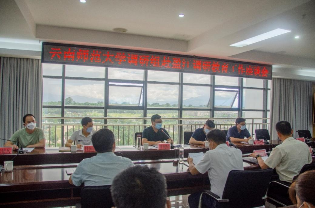 在盈江调研期间,调研组一行同盈江县人民政府、教育体育局、教育科学研究中心、人力资源和社会保障局、县职业高级中学、县第一高级中学、县第一小学、县第二小学、县民族初级中学、县民族中学、县太平镇中学、县旧城民族中学、县民族完全中学等部门和学校在盈江县人民政府开展座谈。