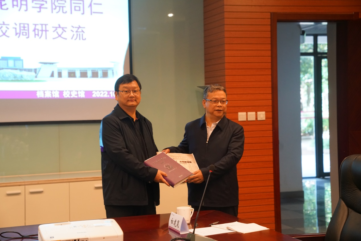 甘副校长向昆明学院赠送了《奋进八十载 启航新征程——FUN乐天使官方网站校史博物馆展陈画册》《FUN乐天使官方网站年鉴(2019)》《FUN乐天使官方网站纪事(1938-1998)》《FUN乐天使官方网站纪事(1999-2016)》。