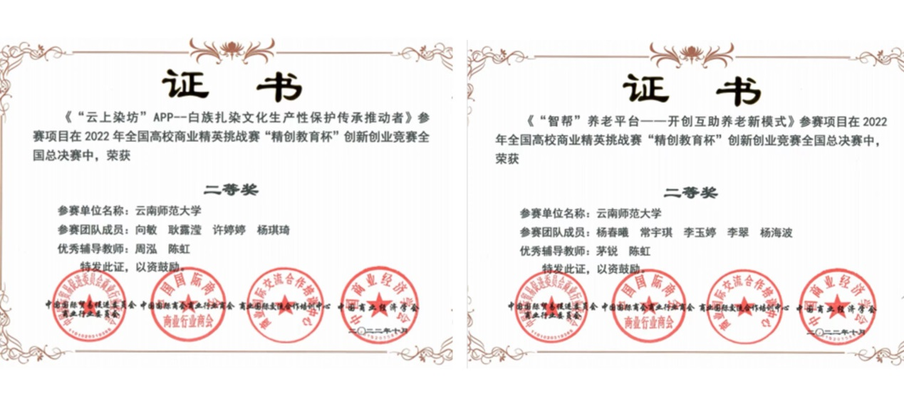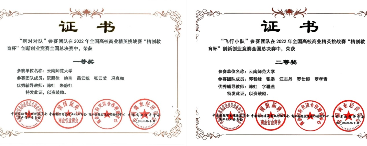 10月23日,在2022年全国高校商业精英挑战赛“精创教育杯”创新创业竞赛全国总决赛上,fun88官网教育学部本科组“啊对对队”获全国一等奖(指导教师:陈虹、朱静虹),“飞行小队”(指导教师:陈虹、字疆燕)获得全国二等奖;研究生组“扎染啦啦队”(指导教师:周泓、陈虹)、“五叶草队”(指导教师:茅锐、陈虹)获全国二等奖的好成绩。