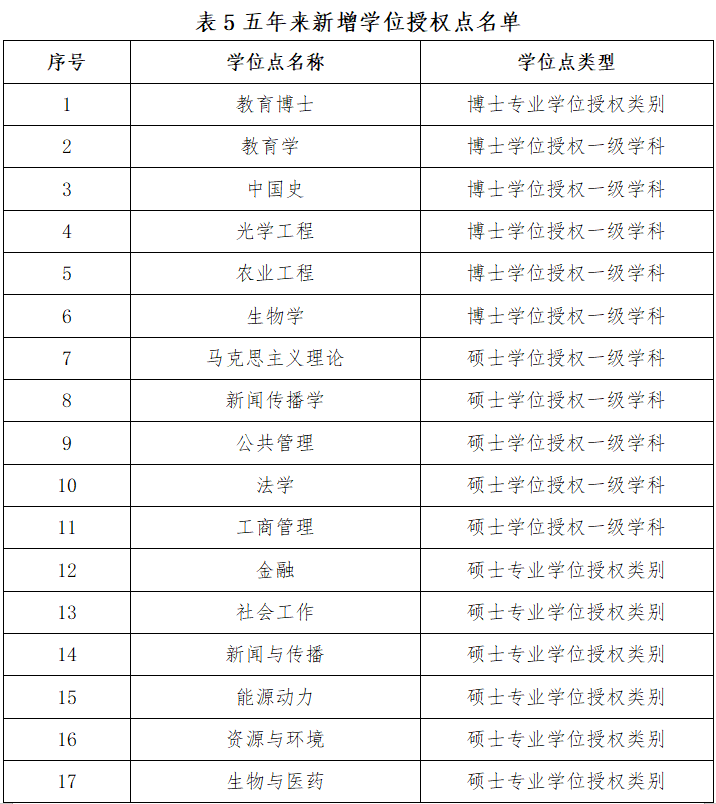 学校新增5个一级学科博士学位授权点(教育学、中国史、光学工程、农业工程、生物学)、1种博士专业学位授权类别(教育博士)、5个一级学科硕士学位授权点(马克思主义理论、新闻传播学、公共管理、工商管理、法学)、6种硕士专业学位授权类别(金融、新闻与传播、社会工作、能源动力、资源与环境、生物与医药)。在2021年省级博士学位授予立项培育工作中,新增16个省级立项建设培育博士点。目前学校已拥有一级学科博士学位授权点6个、博士专业学位授权类别1种、一级学科硕士学位授权点28个、硕士专业学位授权类别19种,实现了博士学位授权点快速增长。