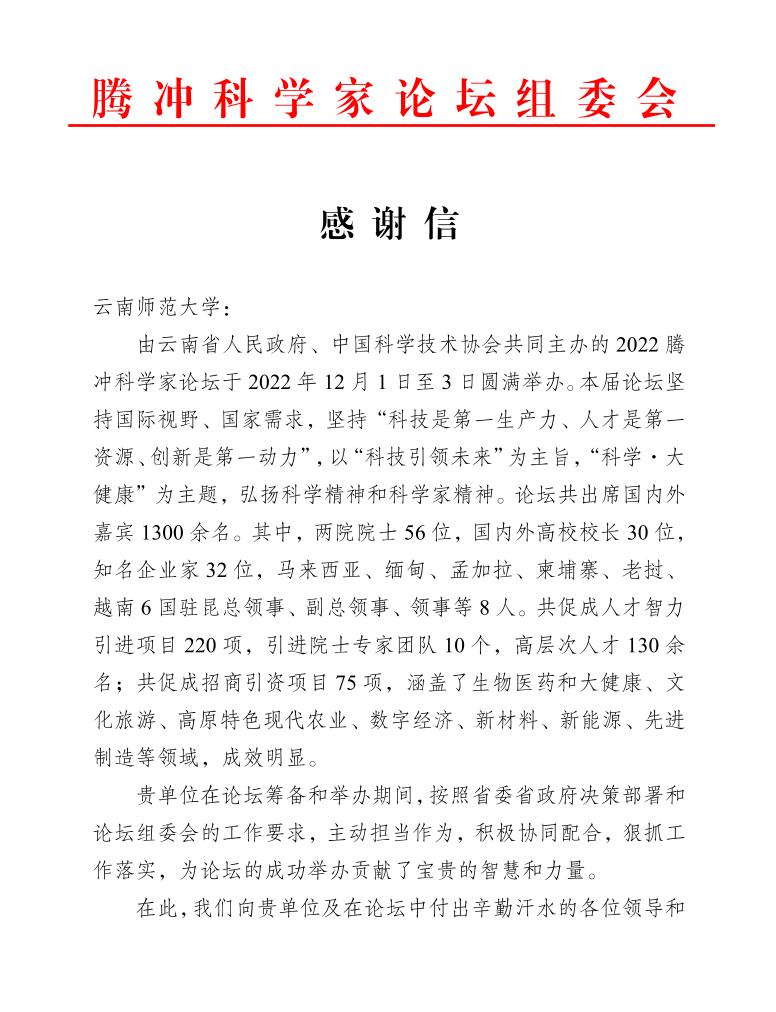 近日,学校收到腾冲科学家论坛组委会发来的感谢信。信中指出,在论坛筹备和举办期间,FUN乐天使官方网站按照省委省政府决策部署和论坛组委会的工作要求,主动担当作为,狠抓工作落实,为大会的成功举办贡献了宝贵的智慧和力量。