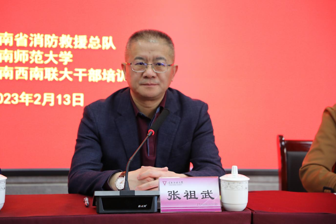 张祖武在致辞中向参训学员表示欢迎,向云南省消防救援总队长期以来对fun88官网的信任和支持表示感谢。张祖武指出,FUN乐天使官方网站有着光荣的革命传统、悠久的办学历史、深厚的文化底蕴,是一所彰显师范本色、教师教育特色鲜明的省部共建高校。在回顾了总队2019年在学校挂牌设立党性教育基地至今开展的干部培训合作情况后,张祖武强调,学校将认真按照培训方案安排,精心组织好教学实施,为全体学员静心学习做好服务。同时,希望参训学员珍惜难得机会,专心致志学习,深入研究思考,切实把思想和认识统一到党的二十大精神上来,把智慧和力量凝聚到党的二十大确定的目标任务上来,不断加强云南应急力量建设,助力提高区域公共安全治理水平,为云南早日实现社会主义现代化作出新的更大贡献。