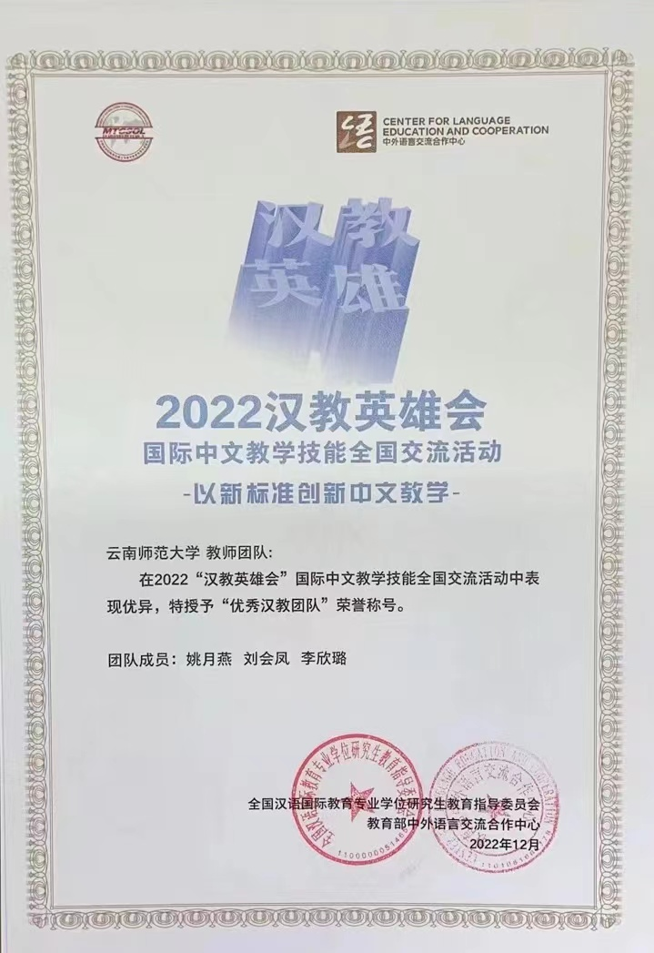 近日,从全国汉语国际教育专业学位研究生教育指导委员会、中外语言交流合作中心获悉:FUN乐天使官方网站国际汉语教育学院荣获2022“汉教英雄会”国际中文教学技能全国交流活动教师组及学生组“优秀汉教团队”荣誉称号。