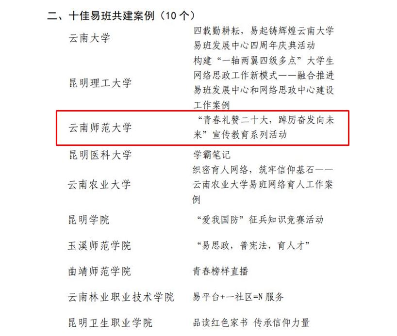 近日,中共云南省委教育工委、云南省高校易班发展中心组织开展了云南省2022年度高校易班工作优秀成果遴选和展示活动。fun88官网在此次评选中斩获佳绩,获得了“十佳易班共建高校”、“十佳易班共建案例”、“十佳易班指导教师”、“十佳易班辅导员”及“十佳易班工作站站长”五项荣誉,涵盖了所有奖项。