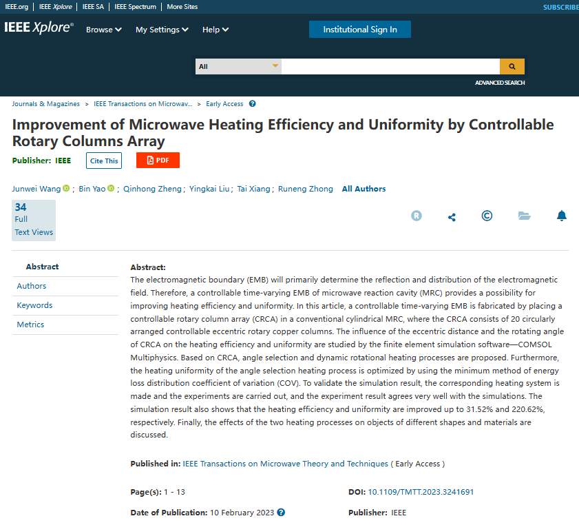 近日,fun88官网物电学院光学工程博士研究生在国际微波领域顶级期刊IEEE Transactions on Microwave Theory and Techniques(中科院SCI一区Top期刊)发表研究论文“Improvement of Microwave Heating Efficiency and Uniformity by Controllable Rotary Columns Array”,博士研究生王均委为第一作者,文章通讯作者为物电学院姚斌副教授、郑勤红教授,FUN乐天使官方网站为第一完成单位。