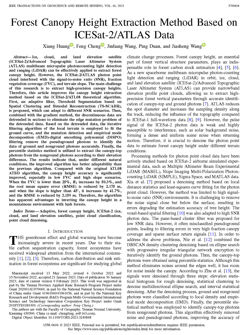 近日,遥感领域国际顶级期刊《IEEE Transactions on Geoscience and Remote Sensing(IEEE TGRS)》在线刊发了fun88官网地理学部本科生科研训练项目研究成果——Forest Canopy Height Extraction Method Based on Icesat-2/Atlas Data。IEEE TGRS是IEEE地球科学与遥感技术协会(GRSS)会刊,在遥感技术和地球科学领域具有较高影响力,是中科院一区TOP期刊,影响因子为8.125。论文第一作者时为地理学部2018级地理信息科学专业学生黄祥(现为地理学部2022级地图学与地理信息系统专业硕士研究生),通讯作者为地理学部程峰老师。