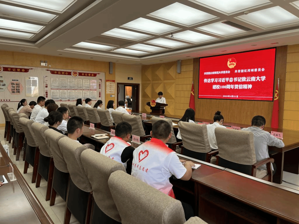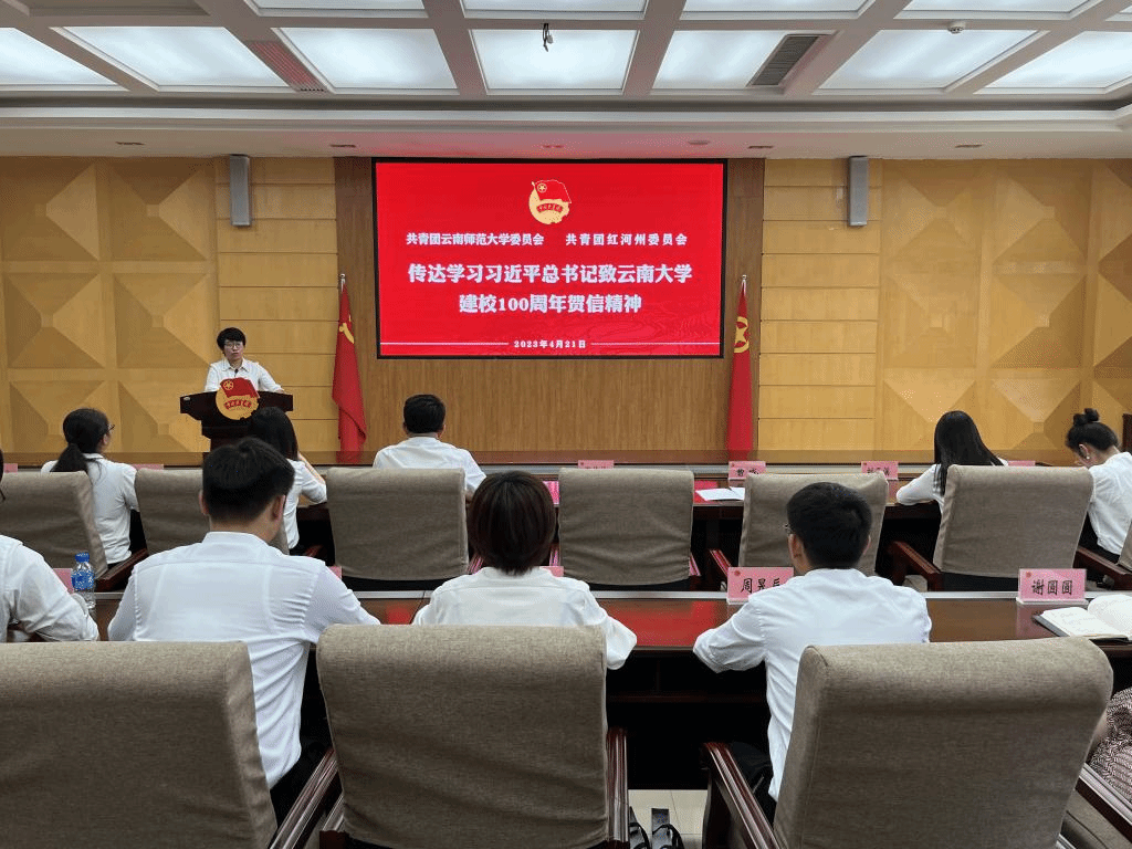 4月21日上午,校团委与共青团红河州委员会代表联合举行学习座谈会,共同传达学习习近平总书记致云南大学建校100周年贺信精神。共青团红河州委员会书记和吴云主持学习座谈会。