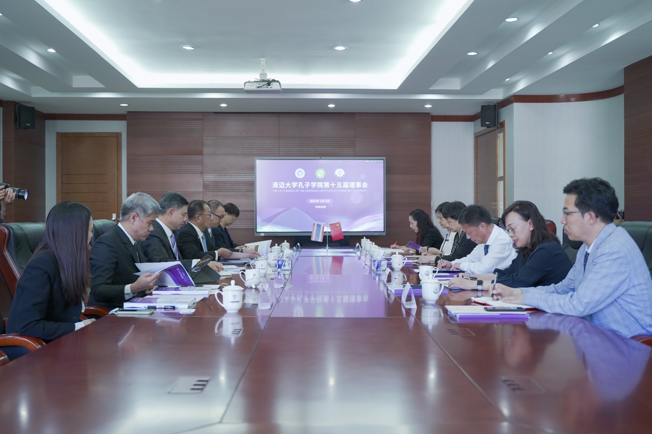 5月5日上午,清迈大学孔子学院第十五届理事会在fun88官网行政楼341会议室召开。校长王德强,副校长郝淑美,华文学院党委书记和雪莲、院长王秀成,对外合作交流处处长黄瑛,清迈大学校长彭拉·习班迪蒙坤,副校长巴瑟·叻格良莱,副校长比迪蓬·佑蒙坤,校长助理沃拉甘亚·卟拉帕塔娜,清迈大学孔子学院中方院长连晨,泰方院长李雄英参加会议。会议由郝淑美主持。