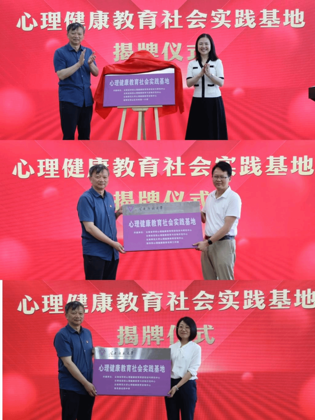 FUN乐天使官方网站心理健康教育咨询中心与昆明市西山区书林第一小学、彭华军心理健康教育名师工作室、陆良县北辰中学进行了共建心理健康教育社会实践基地的挂牌,共同开拓心理健康教育新局面,携手共建咨询服务“试验田”。