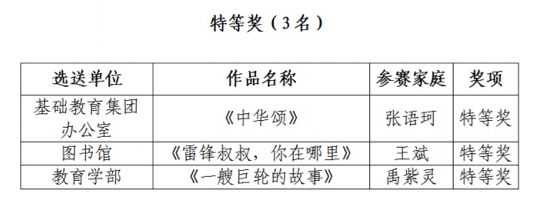 本次“颂党恩·咏经典·传家声”亲子诵读活动共收到17个分工会选送的30个作品,经过工作组的认真评审,最终评定特等奖3名、一等奖4名、二等奖8名、三等奖15名。