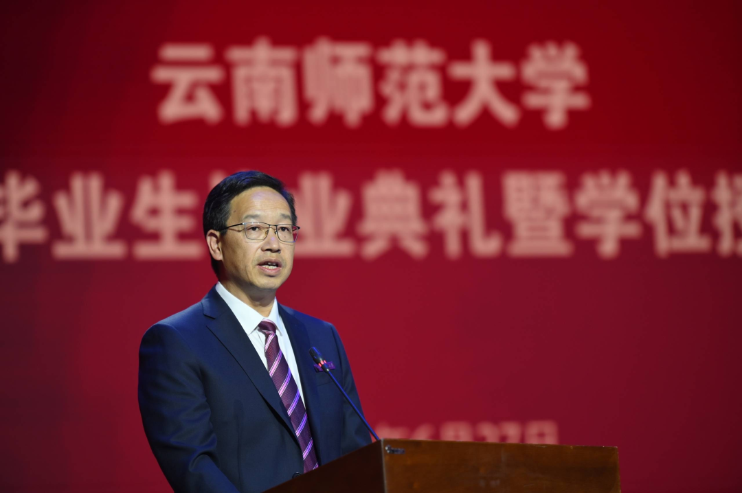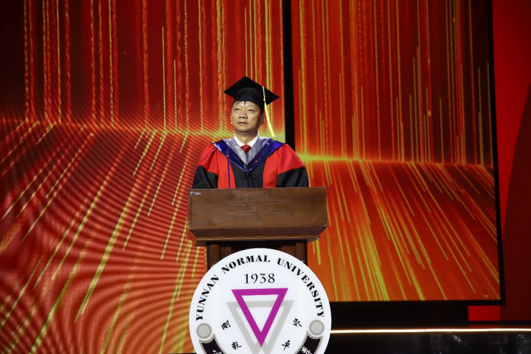 本科毕业生代表黄愿如深情讲述了大学四年她以澄澈之心丈量大地,以好奇之眼探索世界,以敏锐之感拥抱生活,努力成为更好的自己的经历和感受;硕士毕业生代表吴春桃回顾了七年在校期间的求学经历,分享了理论最终要在实践中检验的学习感悟。在校研究生代表夏煜表示,将接过学长们奋斗的接力棒,在追梦圆梦中鼓舞斗志,砥砺前行。在校本科生代表李思语表示,今后将向学长们看齐,赓续西南联大爱国主义精神,争做民族复兴的时代新人。
