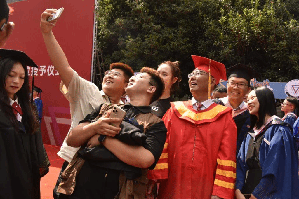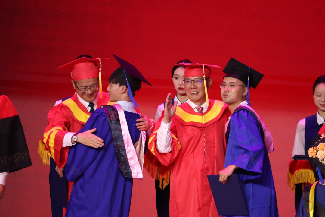 会堂前,师生合影留下美好瞬间,互致祝愿表达良好期许。歌声起,心潮涌,毕业生们身着学位服,纷纷踏入会场。动情处,灿烂的笑容难掩晶莹的泪花,温情的拥抱述说离别的不舍。