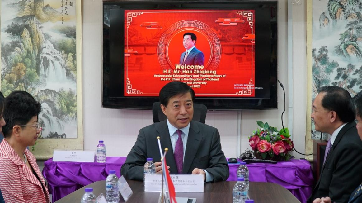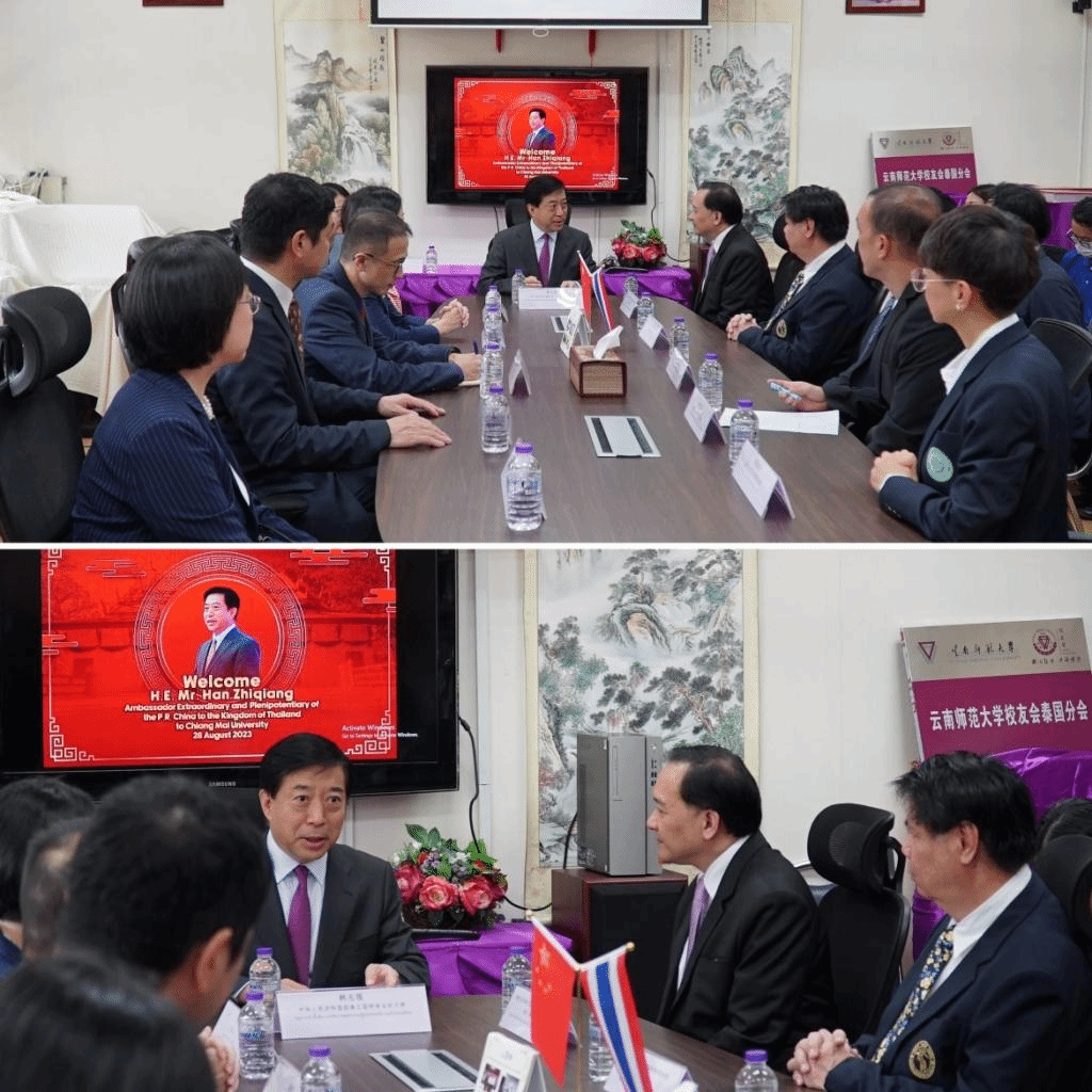 8月28日上午,中国驻泰王国特命全权大使韩志强偕夫人王欢、中国驻清迈总领馆代总领事杨炯、驻泰大使馆参赞范学为、刘敬师、冯俊英一行到清迈大学孔子学院考察调研,清迈大学副校长CHARIN TECHAPUN、TODSAPORN PICHAIYA和相关学院负责人、清迈大学孔子学院全体教师以及清迈大学中国留学生参加交流。