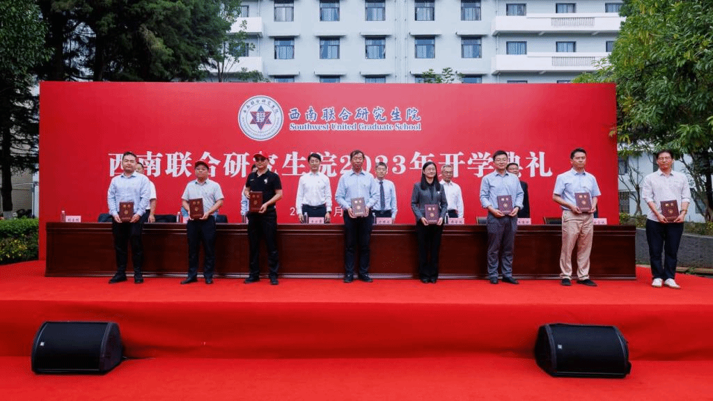 在主席台就坐的领导向2023年新增导师代表颁发导师聘书,并为新生代表佩戴西南联合研究生院院徽。