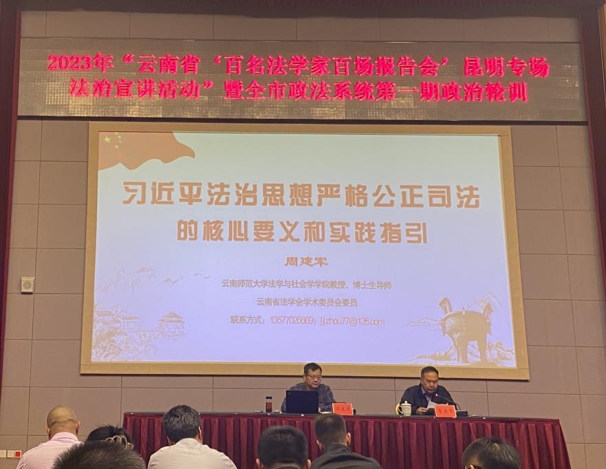 9月28日,云南省“百名法学家百场报告会”昆明专场法治宣讲活动暨“全市政法系统第一次政治轮训”在昆明会堂举办。fun88官网法学与社会学学院周建军教授应邀为全市两千多名政法干警开展了习近平法治思想专题讲座。