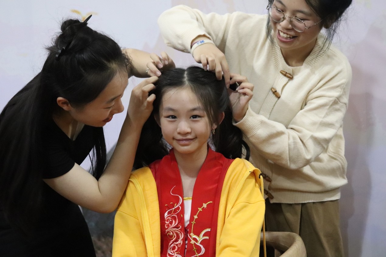 头上倭堕髻,耳中明月珠。缃绮为下裙,紫绮为上襦。簪、钗、环、步摇、珠花整齐地摆放在汉服旁供试穿汉服的外国友人挑选。褪去刚开始的羞涩,他们争先试穿精美的汉服。“我想穿这套,上面的花纹很好看”“我想试试这套,我很喜欢它的颜色和样式”“这些衣服都好精致,好想把它们都穿身上”。不停地有人穿梭其中,尽情挑选着自己想要的风格。“我很喜欢这件红色的,它跟我头上戴的这个花环颜色很搭,我想要穿上它待会去跳一支中国舞蹈《燕无歇》,中国的舞蹈很美丽。”来自印度尼西亚的黄子嘉说道。