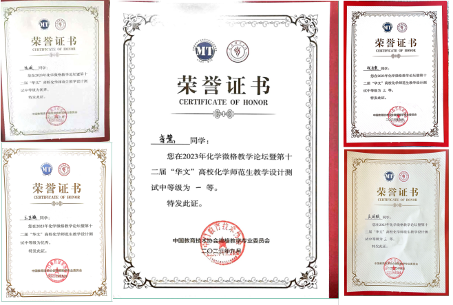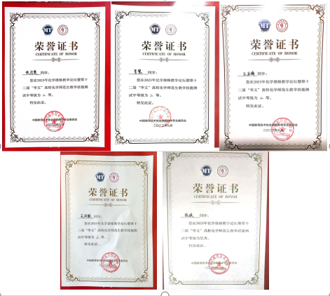 化学微格教学论坛暨第十二届“华文”高校化学师范生教学技能测试与交流展示活动由中国教育技术协会微格教学专业委员会主办,是目前国内教育师范类专业规模最大、参与高校最多的教学技能竞赛展示活动。活动共有来自全国55所院校的287名选手参加,包括教学设计测试和教学技能测试。fun88官网6名同学以扎实的专业功底、独特的教学设计、娴熟的授课技能和严谨的答辩能力,最终获得了喜人成绩:在教学设计测试中李慧同学荣获一等奖,张洁奥、吴润颜荣获三等奖,陈琪、王亚梅荣获优秀奖;在教学技能测试中李慧、王亚梅、张洁奥荣获二等奖,吴润颜荣获三等奖,陈琪荣获优秀奖。