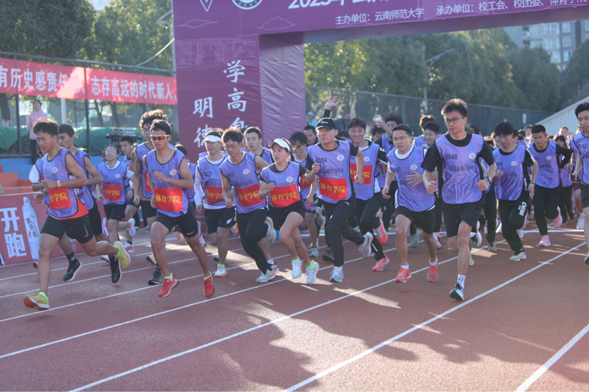 赛前,体育学院运动员江南及张敏娟带领全体参赛选手进行集体热身。奏唱国歌后,校党委副书记李宏、张玮,副校长孟庆红、牛治亮、武友德,纪委书记、监察专员孙剑等多位老师鸣响汽笛枪,数千名云师人激情开跑。
