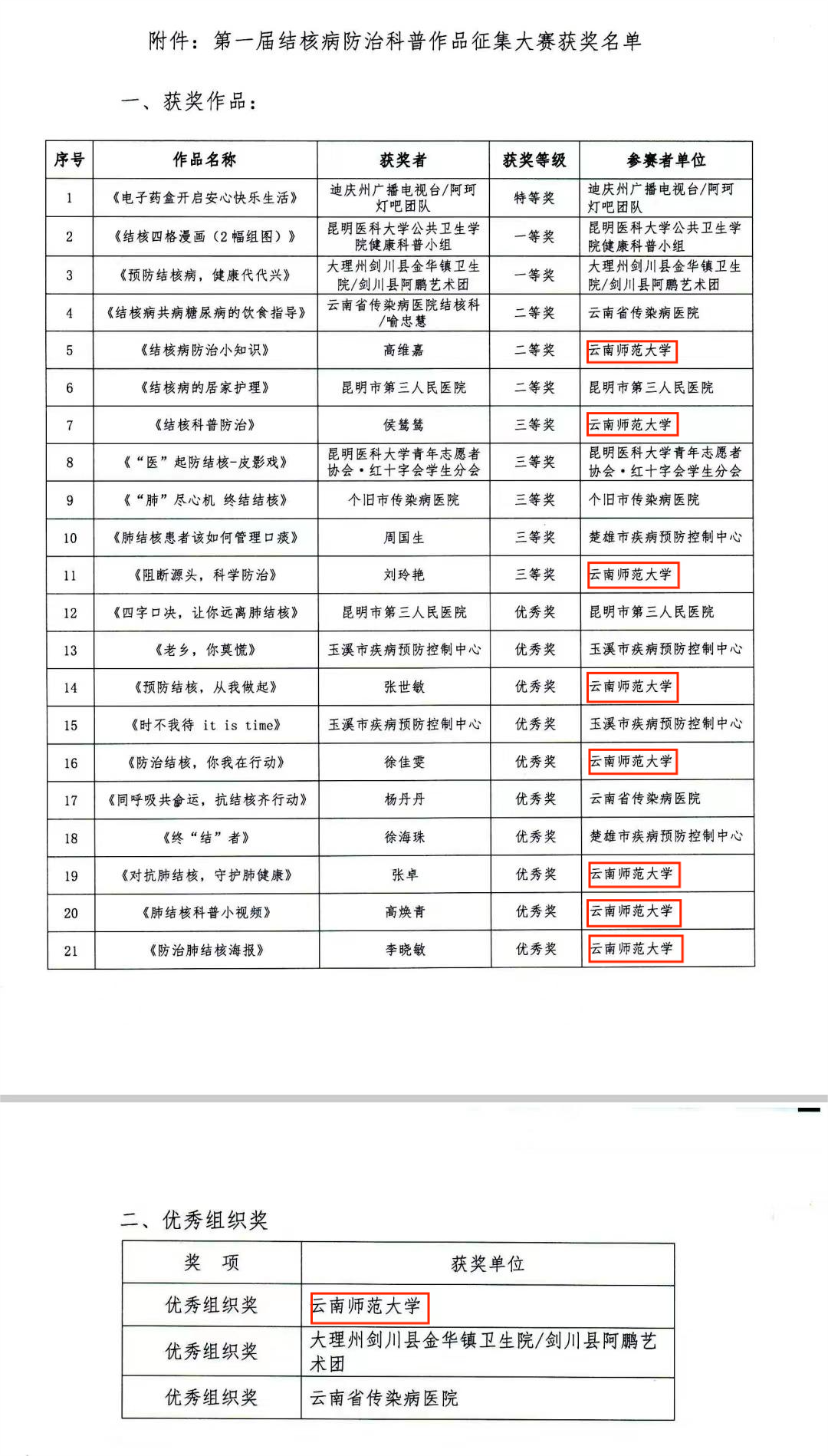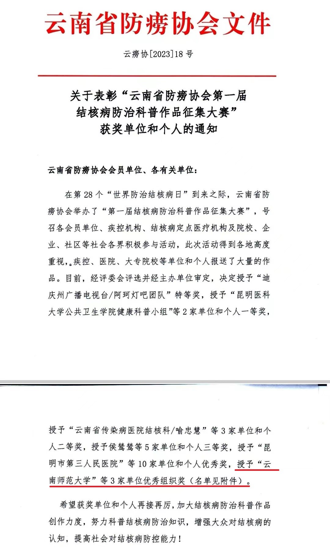 近日,从云南省防痨协会获悉,在“第一届结核病科普作品征集大赛”中,fun88官网有8名同学斩获佳绩,分别获得个人二等奖1名、三等奖2名、优秀奖5名,在本次大赛的21个获奖作品中,fun88官网获奖作品达三分之一以上,学校同时荣获优秀组织奖。
