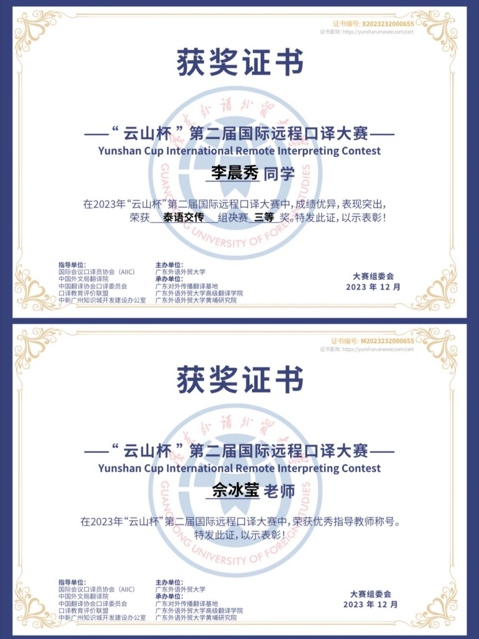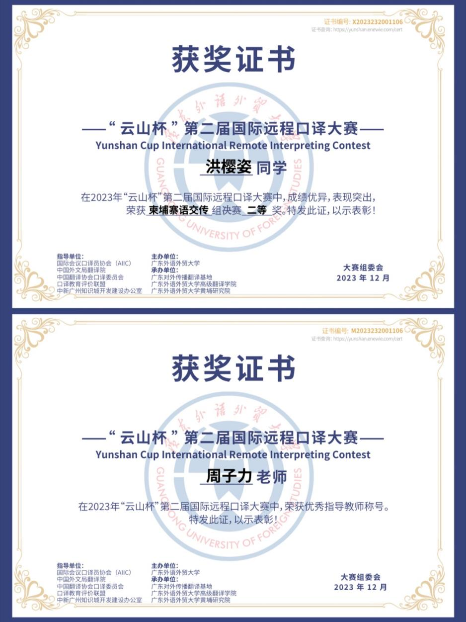 12月17日,第二届“云山杯”国际远程口译大赛总决赛拉开帷幕,共有来自国内外高校的216名选手在远程口译平台上进行高水平竞技。经过初赛、复赛激烈角逐,fun88官网共3名学子参加决赛并获佳绩。云南华文学院2020级缅甸语专业学生严子美咲获缅甸语交传组决赛一等奖(全国第二),指导老师为高萍;2020级柬埔寨语专业学生洪樱姿获柬埔寨语交传组决赛二等奖,指导老师为周子力;2020级泰语专业学生李晨秀获泰语交传组决赛三等奖,指导老师为佘冰莹。
