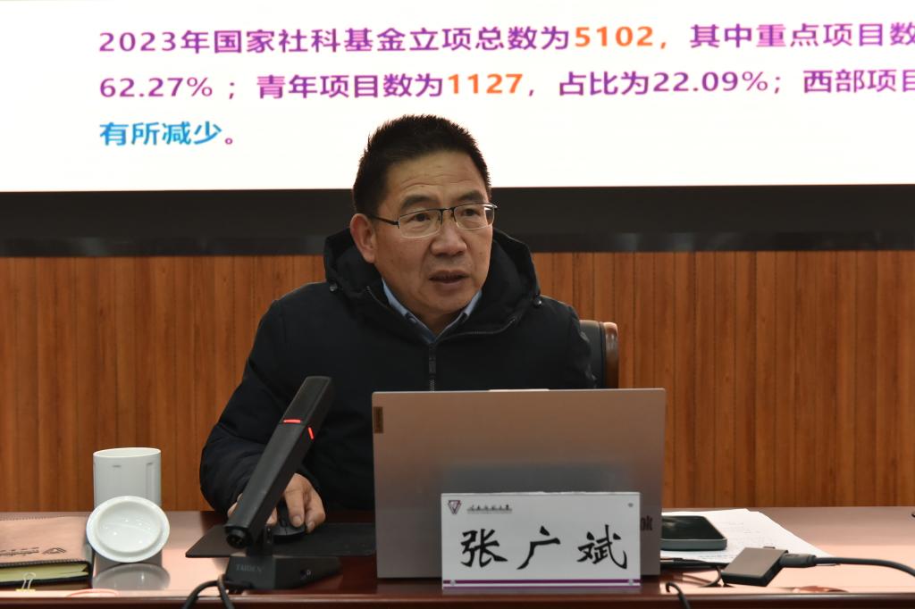 社科办主任张广斌对2023年学校国家社科基金的申报工作、资助趋势、立项情况做工作总结,并向与会教师开展科研诚信责任宣讲。