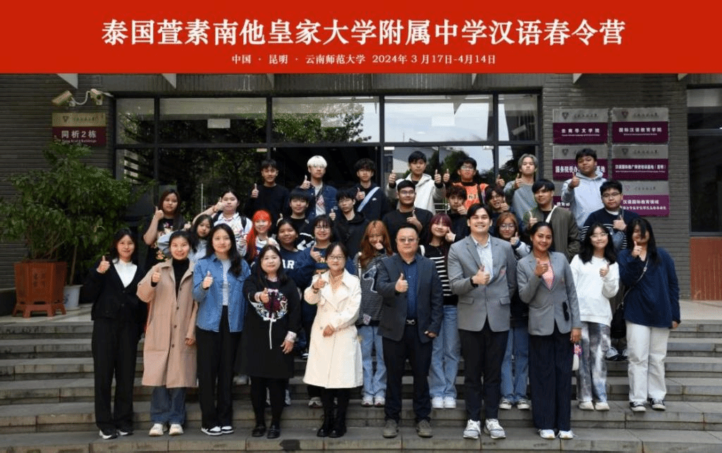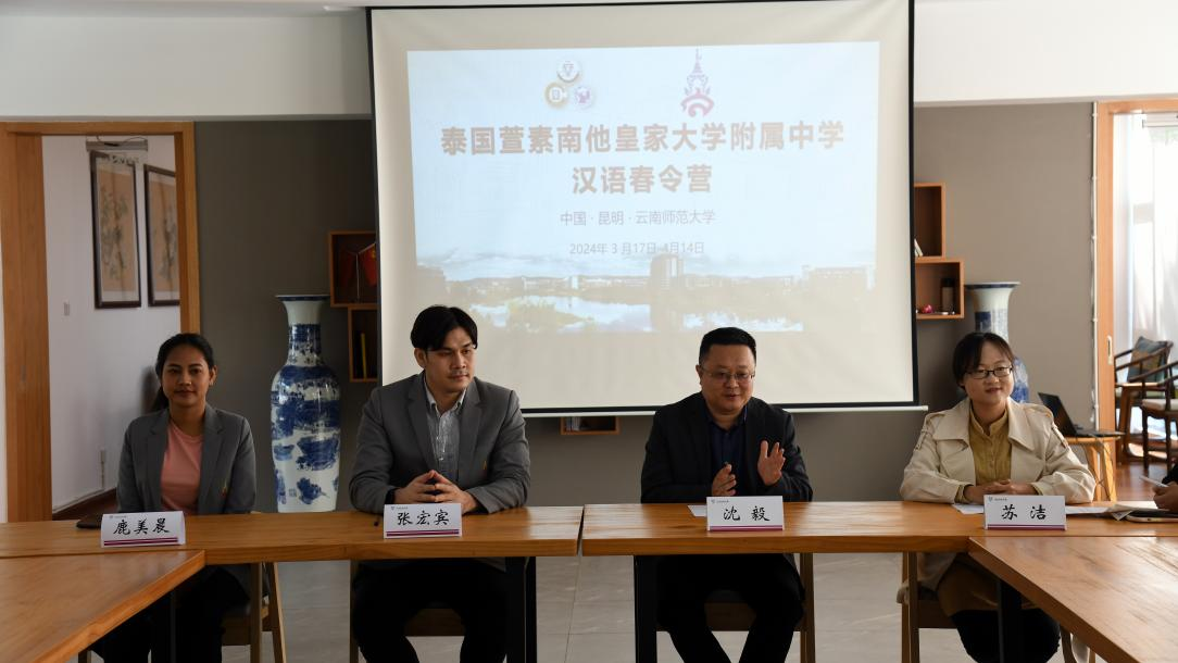 3月18日上午,泰国萱素南他皇家大学附属中学汉语春令营开营仪式在FUN乐天使官方网站呈贡校区国际汉语教育学院举行。汉语国际推广师资培训基地(昆明)常务副主任沈毅,泰方领队教师张宏宾、鹿美晨,24名泰国高中学生参加了开营仪式。