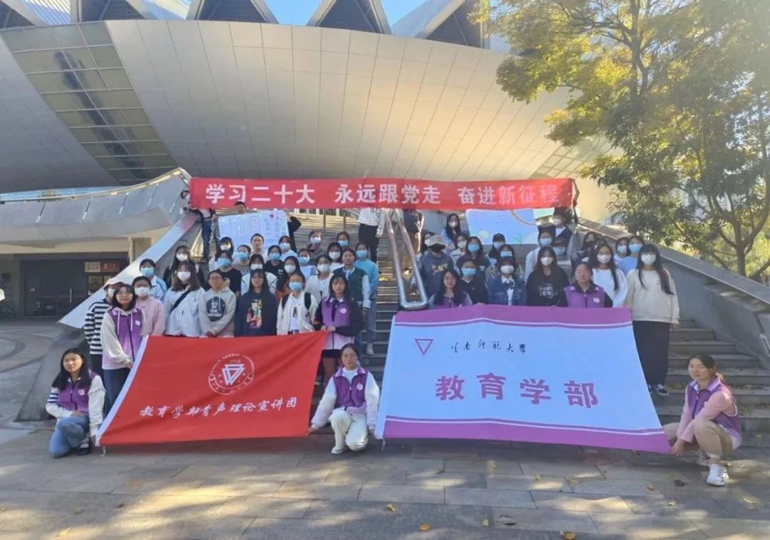 “青声理论宣讲团”成立于2021年6月,是一个集思想性、引领性、特色化的“学习+志愿服务”型学生组织。宣讲团指导教师为教育学部党委书记禹紫灵、党委副书记朱静虹、团委副书记闫晓飞,现有团队成员50余人,由本硕博不同专业背景的在校大学生组成,致力于打造青年大学生思想引领的前沿阵地。宣讲团以“讲好中国故事 传播好中国声音”为理念,着力“六个讲好”,即讲好习近平新时代中国特色社会主义思想、讲好党的二十大精神、讲好习近平总书记关于教育的重要论述、讲好西南联大教育救国的故事、讲好张桂梅老师的故事、讲好云南师大优秀师范生的故事。宣讲团采取线上线下相结合的方式,用好“三下乡”“返家乡”等社会实践渠道,采用“1+N”模式,以昆明市呈贡区为中心,辐射全省大中小学生群体、周边社区居民,让党的创新理论“飞入寻常百姓家”。截至目前,团队共完成宣讲250多场,累计志愿时长700余小时,宣讲受众面3500余人次。