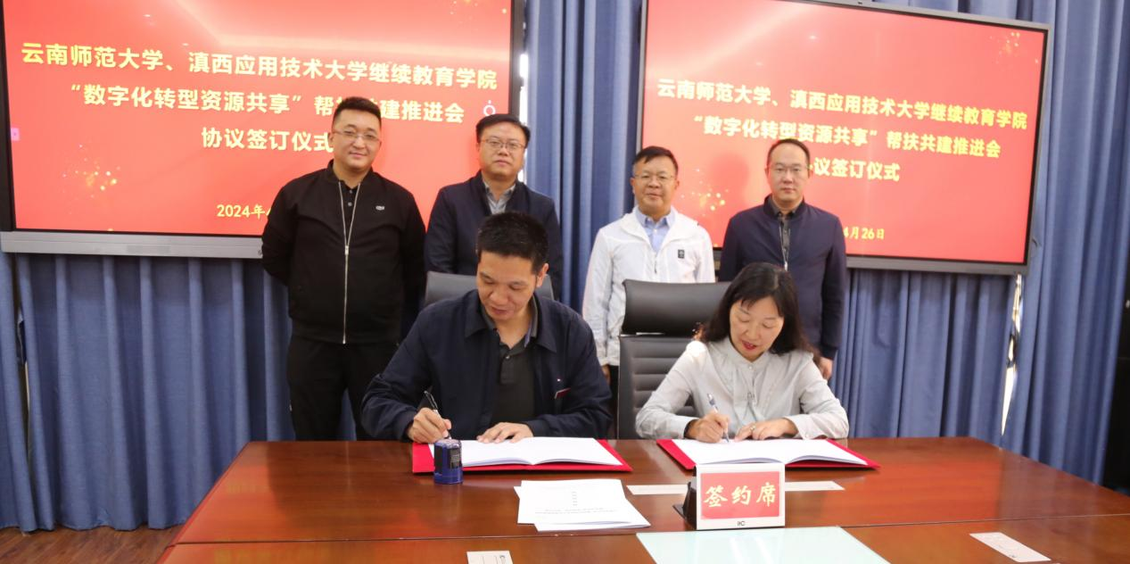 云南师大继续教育学院院长唐瑛和滇西科技应用大学继续教育学院院长陈裕汉签订“数字化转型 资源共享”帮扶共建合作协议。