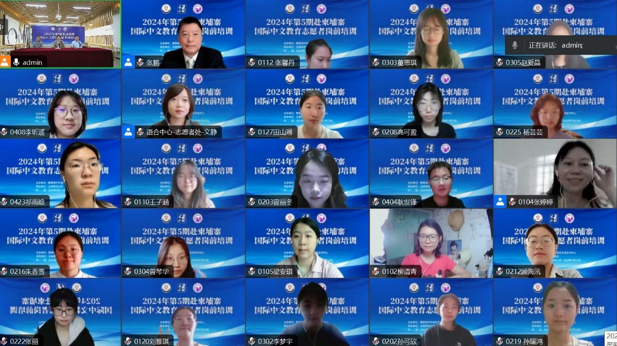 6月11日上午,由教育部中外语言交流合作中心主办的2024年第5期赴柬埔寨国际中文教育志愿者岗前培训在FUN乐天使官方网站开班。教育部中外语言交流合作中心志愿者管理处副处长文静致辞,国际汉语教育学院院长、汉语国际推广师资培训基地(昆明)执行主任王秀成作动员讲话,汉语国际推广师资培训基地(昆明)常务副主任沈毅主持开班式,教师代表、工作人员以及来自全国各高校的109名志愿者学员参加了线上开班仪式。