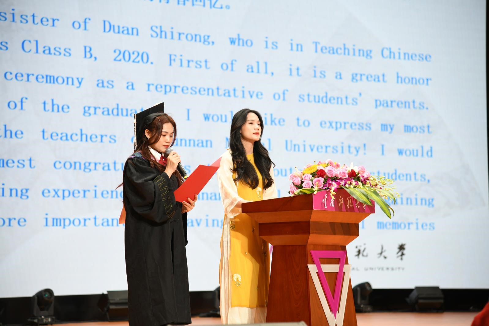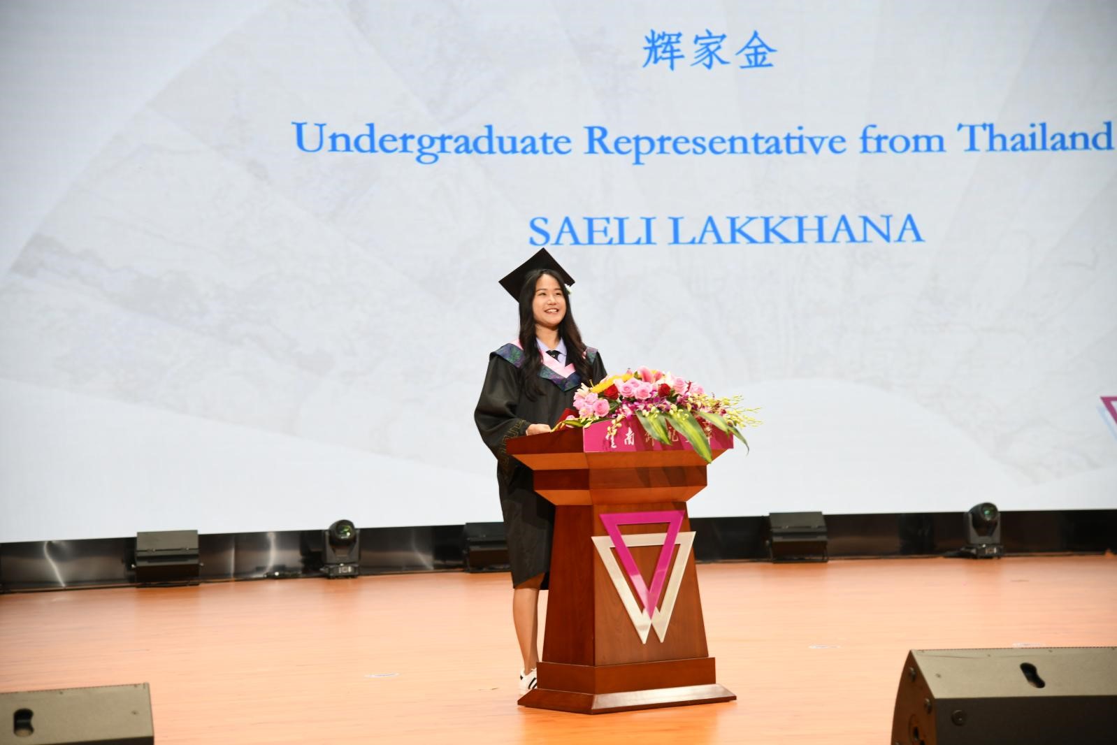 来自泰国的辉家金同学作为本科毕业生代表发言,深情回忆了在云南师大四年大学生涯的收获与成长,感谢中国驻清迈总领馆和云南师大共同设立的“清云奖学金”为她提供了到中国学习深造的机会,感谢在她留学期间给予帮助的师长、亲友和同学。她将把毕业作为人生新的开端,把在中国留学所学的知识用于今后的工作和生活中,以全新的姿态开启美好生活。